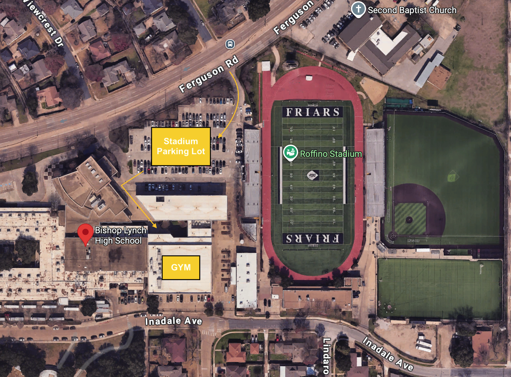 Parking Area: Please come to Bishop Lynch High School located at 9750 Ferguson Road, Dallas. Please enter off Ferguson Ave. and park in the Stadium Parking Lot.All players/parents/fans will then proceed to the main athletic lobby entrance in the Leyden Courtyard. Additional overflow parking is also available in the West Parking Lot.