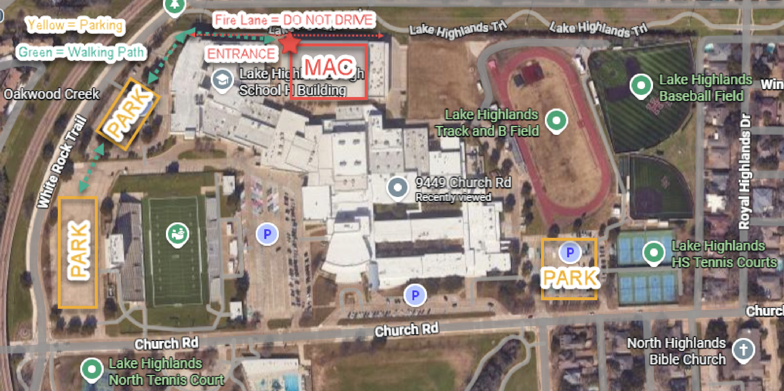 Additional Note: The Fire Lane along the MAC serves as a pedestrian pathway and may not be used for carpool-style drop-off or pick-up. Do not park in the Fire Lane or in painted Coach & Staff parking spaces. The Fire Lane along the LHHS MAC must remain clear at all times for athlete safety and City of Dallas fire compliance.