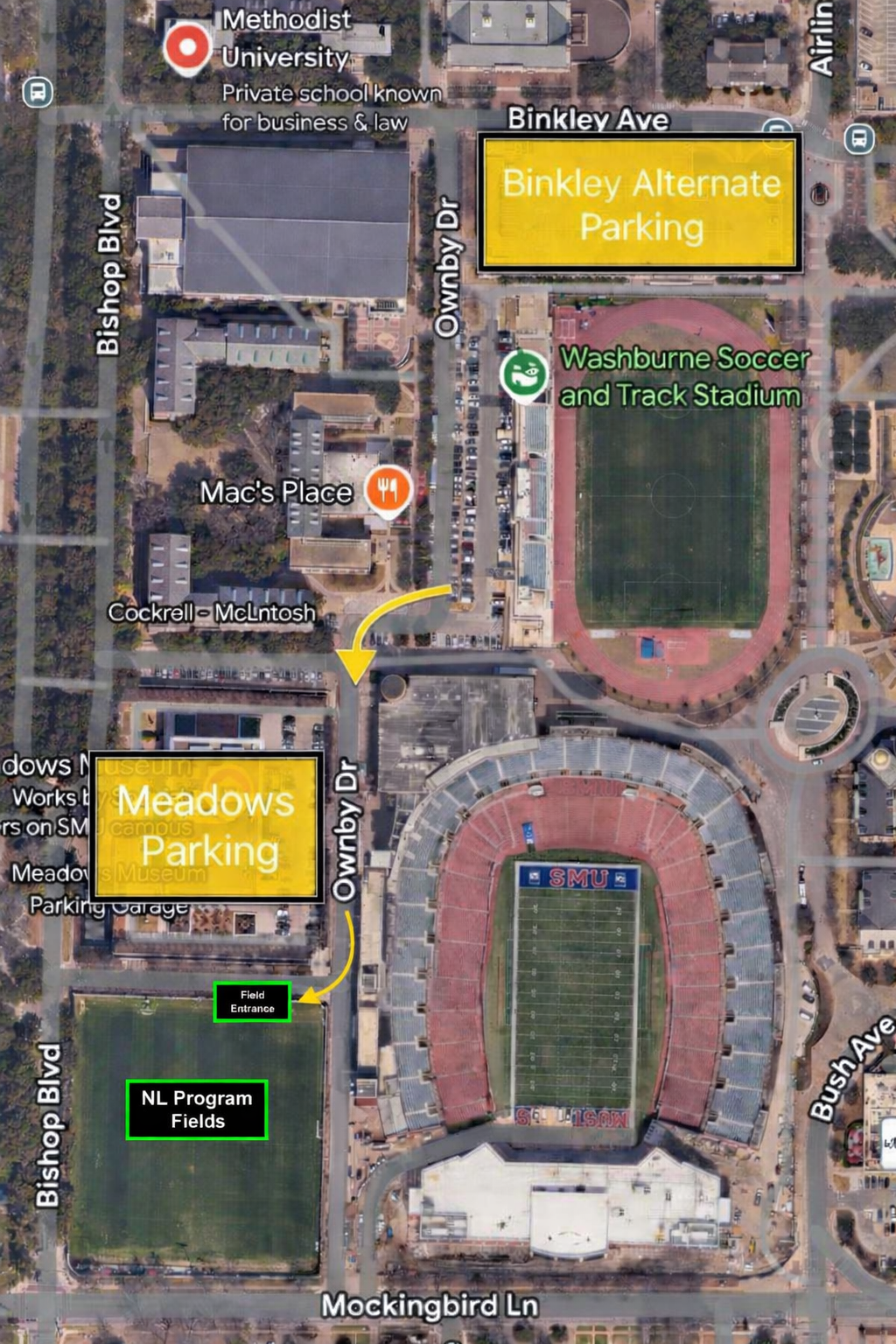 Pettus Practice Fields: Located in close proximity to Ford Stadium, Pettus Practice Fields sit just west of the stadium and are easily accessible from Ownby Drive. ALL Next Level programs will run on Pettus Practice Fields. The fields are adjacent to the main entrance of the SMU campus off of Mockingbird Lane, providing a direct and convenient route for visiting families. For GPS navigation, the best address to use is 5701–5727 Ownby Drive, Dallas, TX 75205. The field entrance is clearly marked along the west side of the stadium, with nearby pedestrian access from both Meadows Parking Garage and Mockingbird Lane. Please allow extra time for parking and walking, especially during high-traffic events.