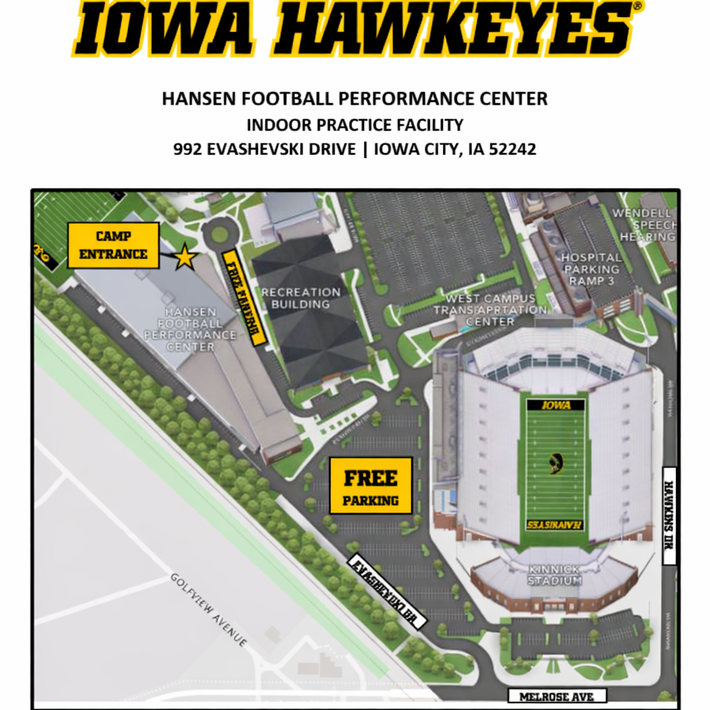 Facility Arrival/Parking: Please come to the Hansen Football Performance Center located at 992 Evashevki Drive, Iowa City. It sits on the west side of Kinnick Stadium across the parking lot (Lot 43). Parking is free and available on Sundays. The easiest and most convenient parking locations are Lot 43 (westside of Kinnick Stadium) as well as Lot 43 Northwest (located in between the Hansen Football Performance Center and the Indoor Track/Rec Building). There are meters located in Lot 43 NW but no payments need to be made as parking on Sundays is free of charge.