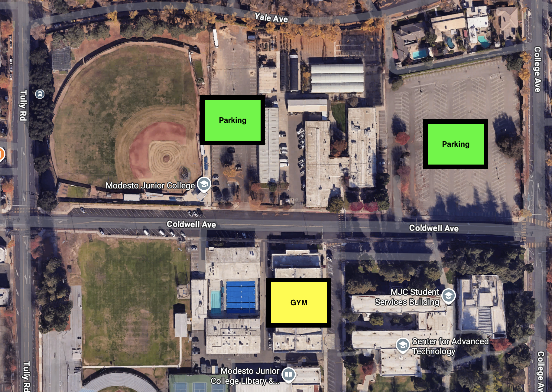Facility Entrance: After you park, look for the Gymnasium across Coldwell Ave.
