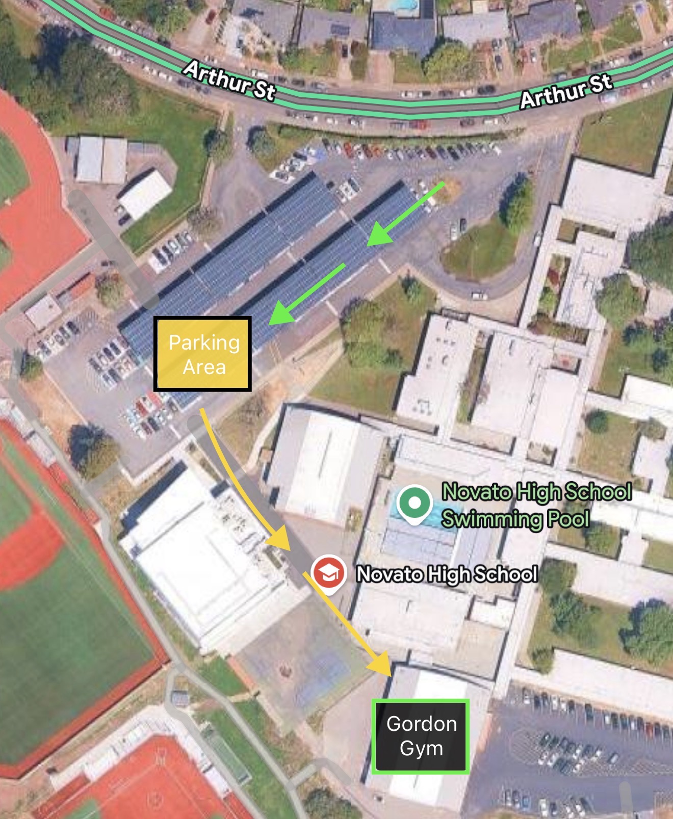 Parking Area: Please come to Novato High School located at 625 Arthur St. Novato, CA 94947. The volleyball program is in the Gordon Gymnasium (see map). Please park in the back of the lot furthest from the main road.