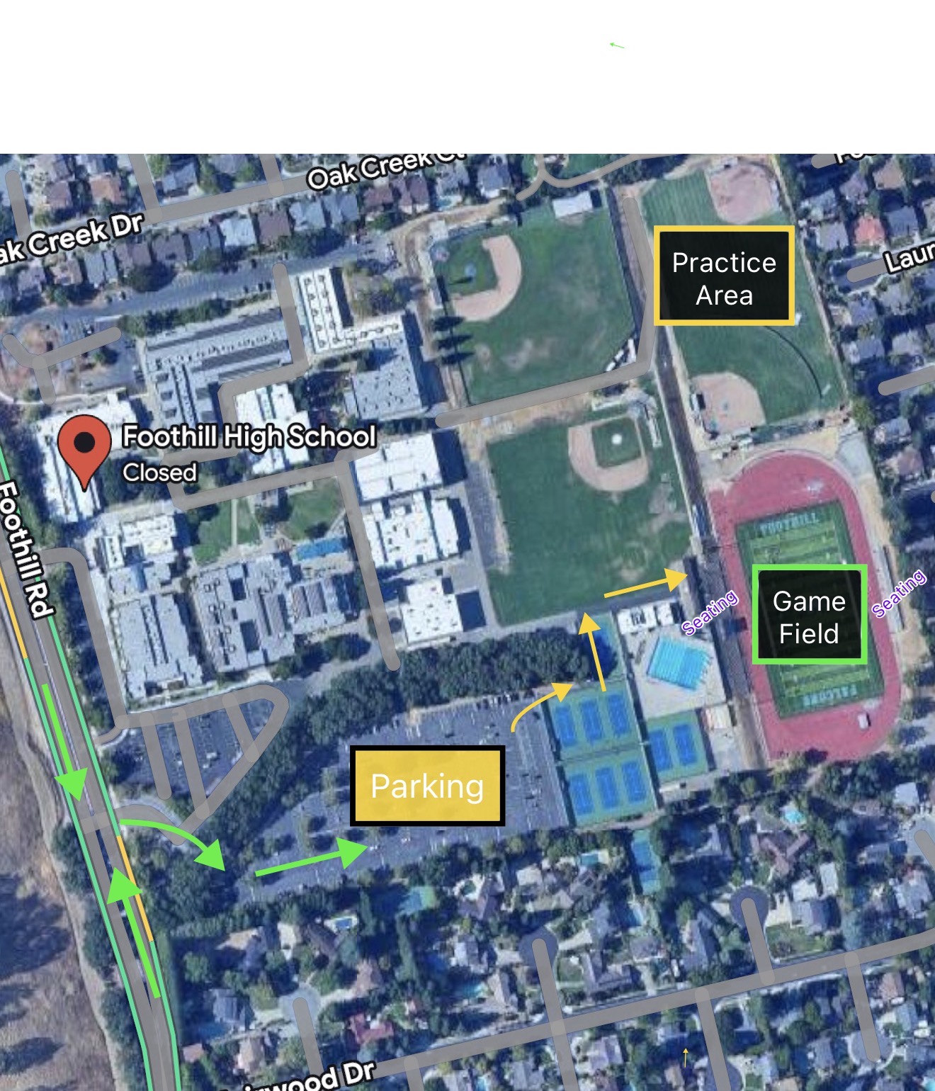 Parking Area: Please park in the back parking lot off Foothill Road near the tennis courts. Access to the practice and game fields is adjacent to the bad end of the parking lot closest to the tennis courts.
