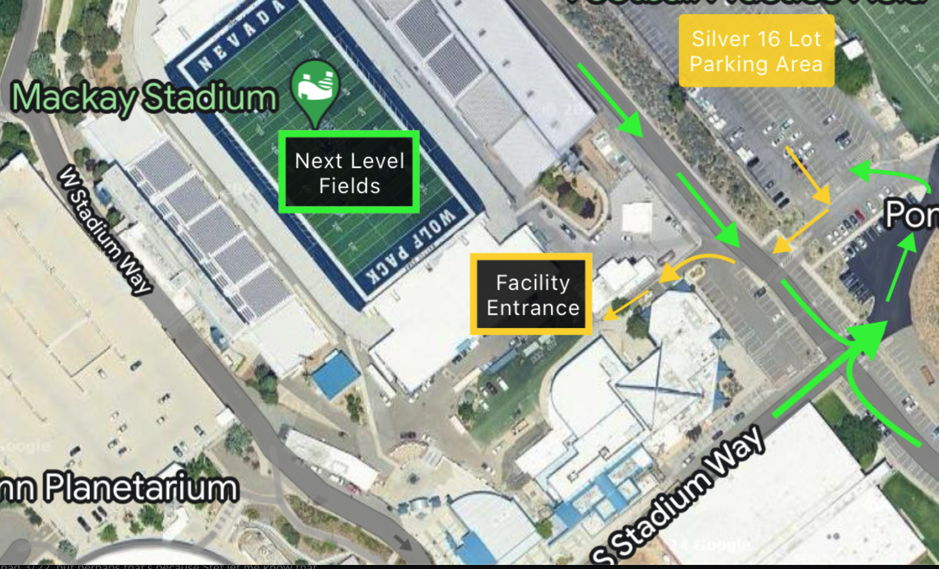 Parking Area: Please park in the West Stadium Parking Garage and enter Mackay Stadium through Gate 1 at the Southwest Corner of the stadium. We no longer have the large parking lot next to the practice fields as that is under construction for the new indoor facility.