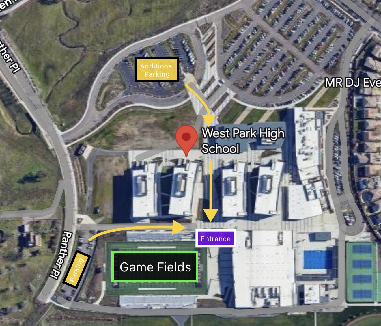Parking Area: Please come to 2401 Panther Pl. Roseville, CA 95747. Please park in either the lot adjacent to the stadium or to the school, as designated on the map.