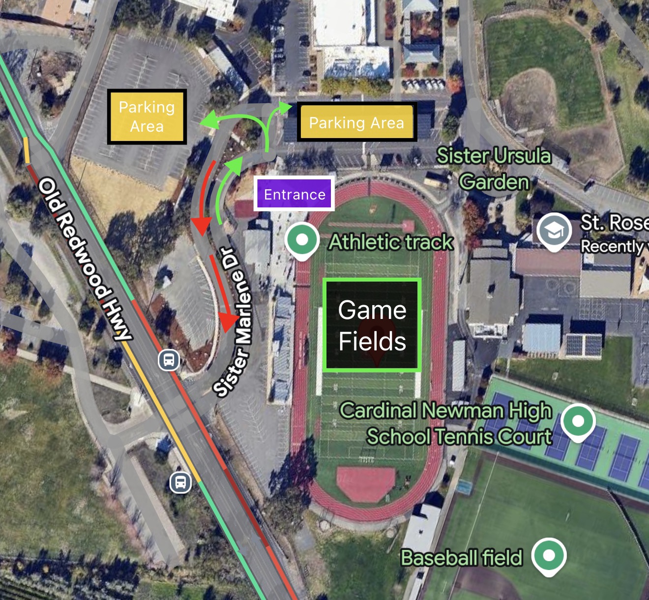 Parking Area: Parking at Cardinal Newman High School can be accessed off Old Redwood Hwy. The address of 4320 Old Redwood Hwy in Santa Rosa will lead to the parking entrance area. Using the traffic light entrance, park in the spaces between the gym and the field or the large parking lot near the exiting drive.