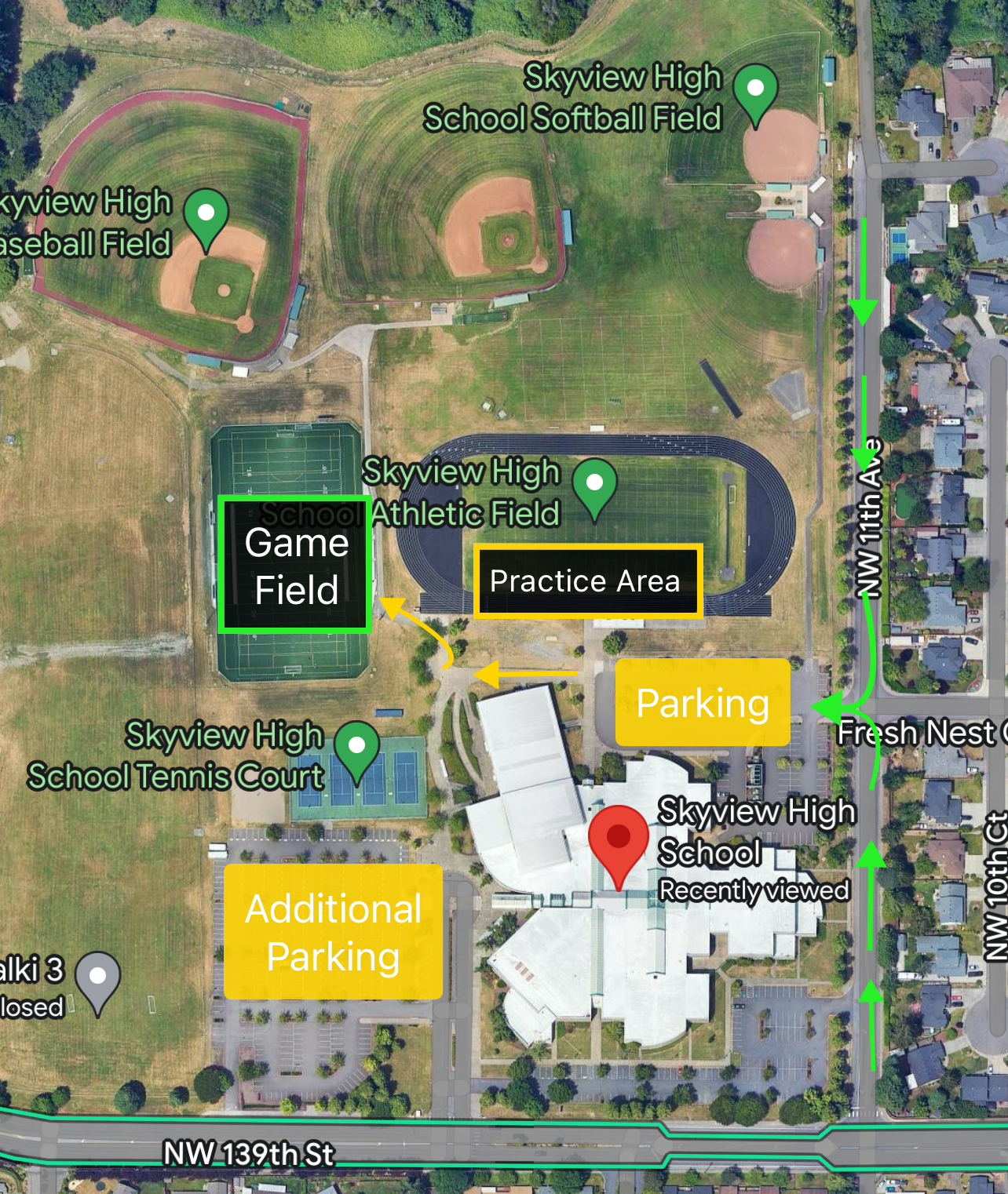 Facility Arrival/Parking: Please come to 1300 NW 139th St, Vancouver, WA 98685. There are two parking lots, one is located in front of Skyview HS that is accessed at the main entrance. There is a second lot that is closer to the fields located behind the school and is accessible if traveling north on NW 11th Ave.